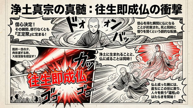 ただし、生身の肉体を持っているために、この世で仏に成ることはできません。ですが、浄土に往生して仏と成る因はすでに満足しているので、肉体が滅するとき……つまり命終のそのときに仏に成るのです。